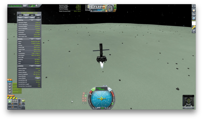 Once we arrive at our encounter with the Mun’s sphere of influence, we activate runmode 8 to begin circularizing into a lunar orbit. We advance time again to bring the vehicle to the periapsis, where we engage the engines once again in retrograde to drop into an elliptical orbit with a low periapsis around the Mun. Once the periapsis falls below its target threshold, we cut the engines and wait until we coast down to the periapsis.