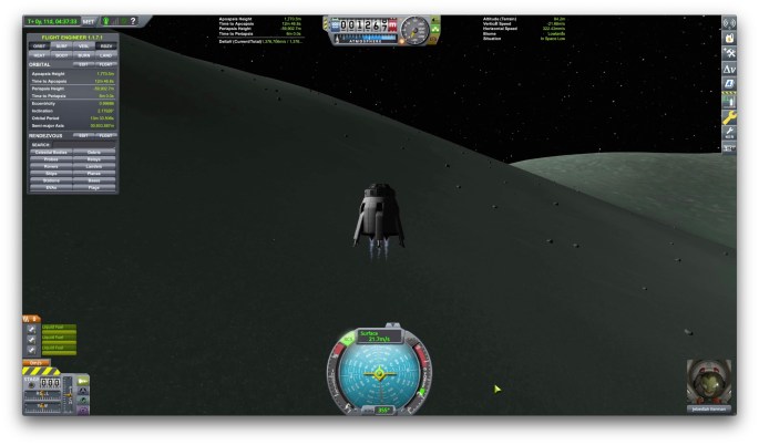 As he left the Mun surface, he pondered his likelihood of surviving the re-entry into Kerbin’s atmosphere without any kind of enclosure. He had to jettison the engine to reveal the heat shield he would use to keep cool during the aerobraking maneuver. The engineers warned about the possibility of some light heating on the re-entry, but Jeb got an A in ablative materials class. He knew this was a suicide mission. He had mistakenly dropped the Kerbin periapsis too low when leaving the Mun, and he had no fuel left to correct the mistake. He hoped for the best, but…