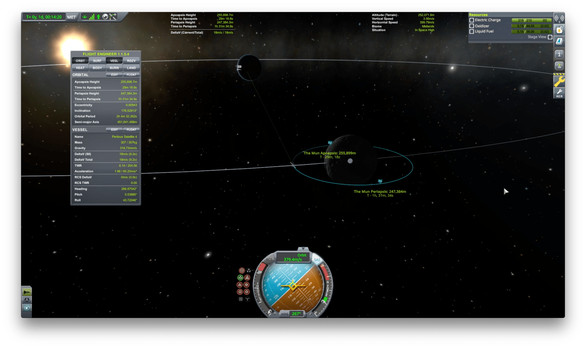 First, let’s expand to consider the nearest moon. It requires more deltaV to get there, and more still to stabilize in a circular orbit. The good news is our Kerbin orbital satellite is over designed for its task. Its first stage does almost all the work, and we have plenty of fuel left over in the second stage for transfer orbit burns.