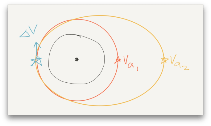 At this point, you might feel confused. In an elliptical orbit, the velocity changes along the path, so isn’t that the same as delta-v? Well, not exactly. As the craft moves around the ellipse, it speeds up toward the low point (or periapsis) and slows down toward the high point (or apoapsis). Each time the craft travels around the path, it returns to the periapsis with the same speed as it had the last time. Unless there is some other influence acting on the craft, it must obey the laws of physics and mathematics.